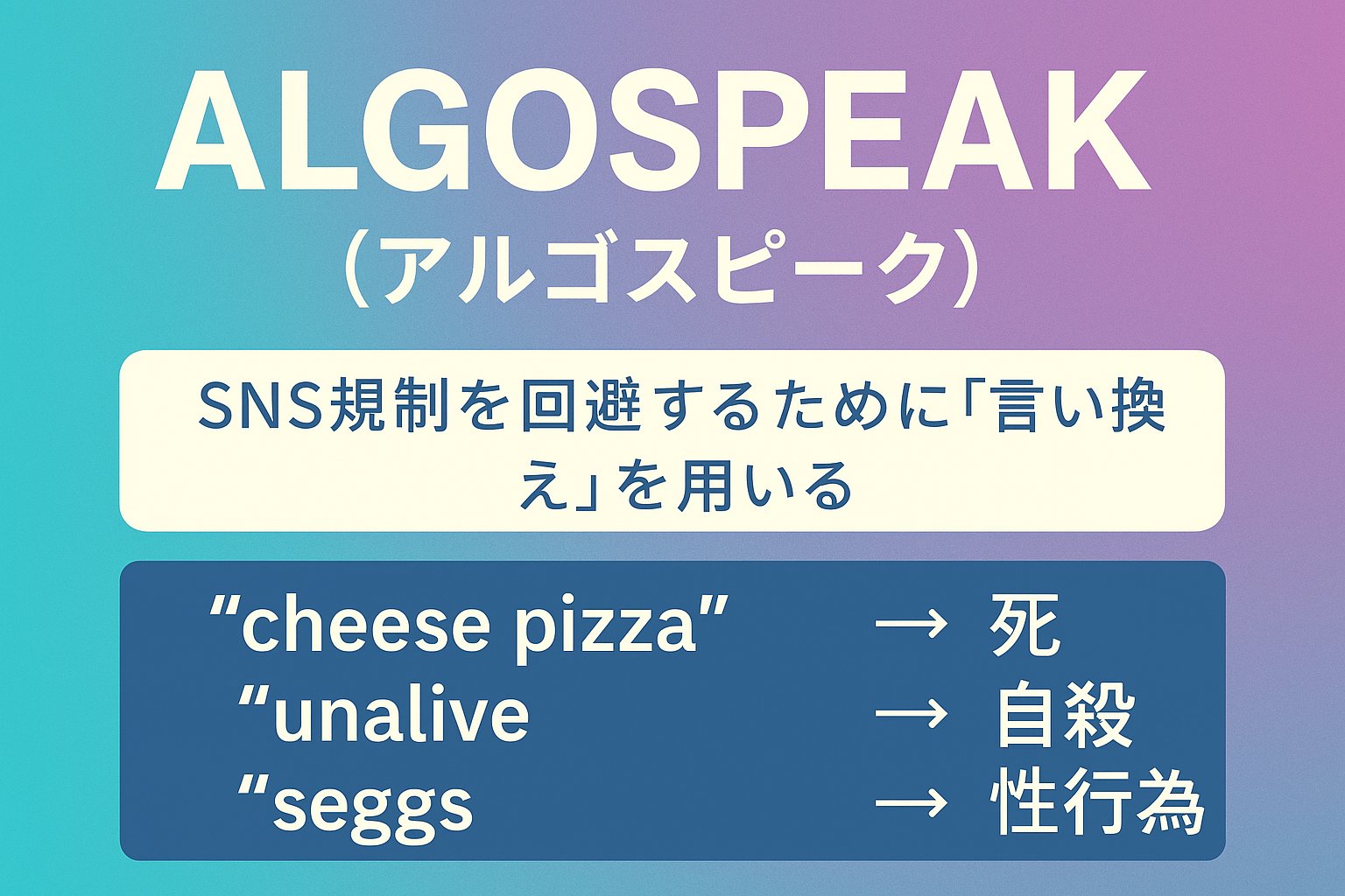 その名も 「アルゴスピーク(Algospeak)」。これは、SNSのAIアルゴリズムによる投稿削除や制限を回避するために、ユーザーたちが使い始めた「新しいネットスラング文化」です。