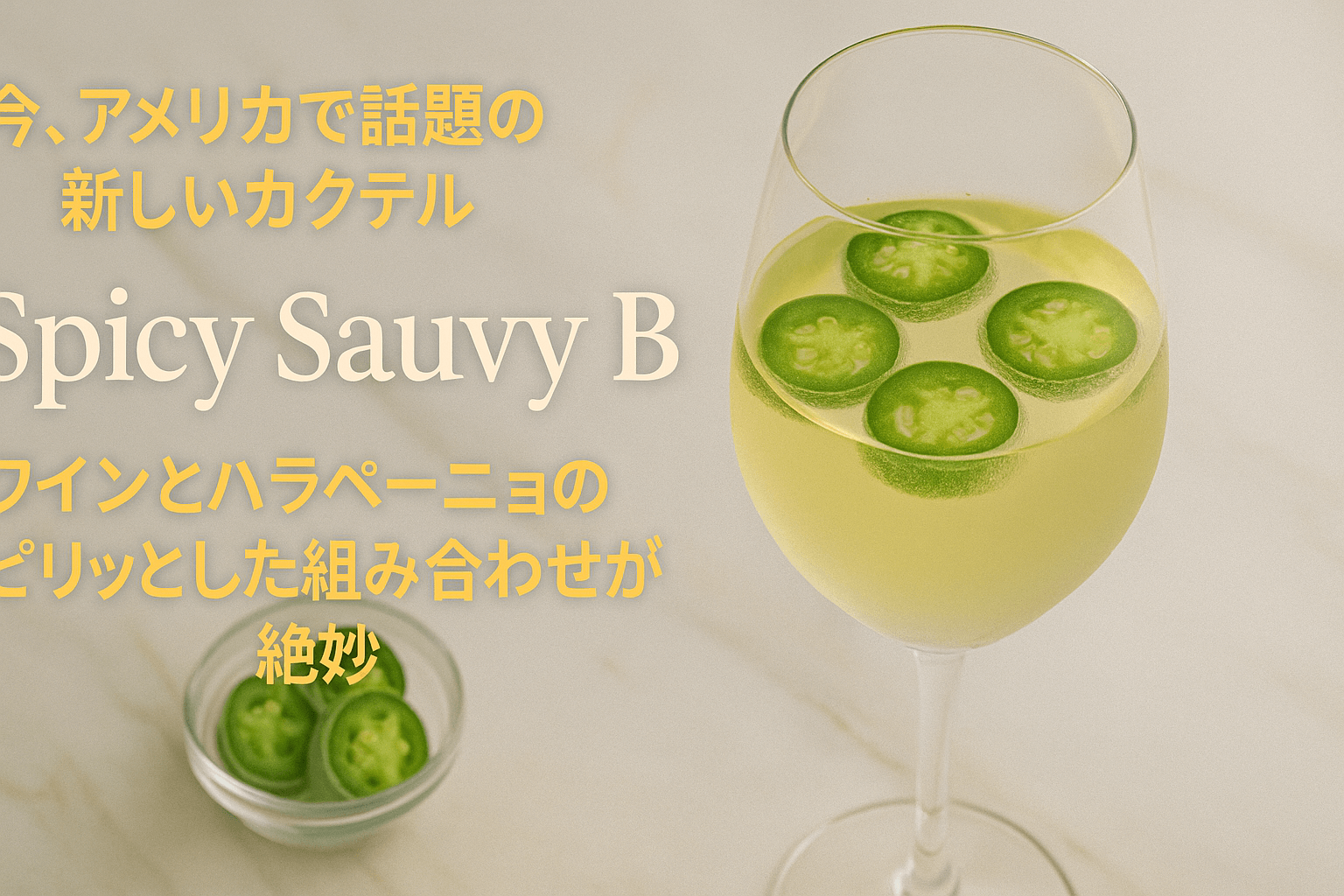 「Spicy Sauvy B」は、ワインとスパイシーなハラペーニョを組み合わせた新感覚のカクテル。ピリッとした辛さがワインに溶け込み、まったく新しい味わいを楽しむことができます。アメリカのTikTokで話題になっているこのトレンドを、ぜひ試してみてください。きっと、あなたのお気に入りの一杯になること間違いなしです!